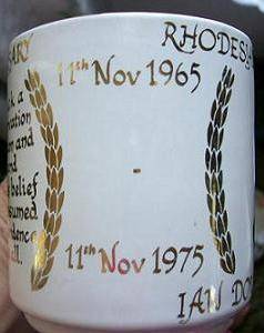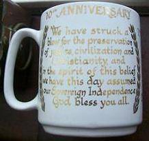 Tenth Anniversary  U.D.I.Commemorative Mug .   Made by Norbel Potteries,  Salisbury.   No chips or cracks.   9cm high,  8cm dia.