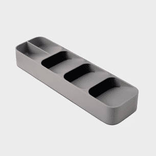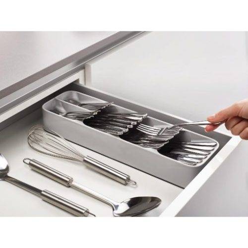 It angles and layers each compartment on top of each other so you can store a full cutlery set in less than half the space.