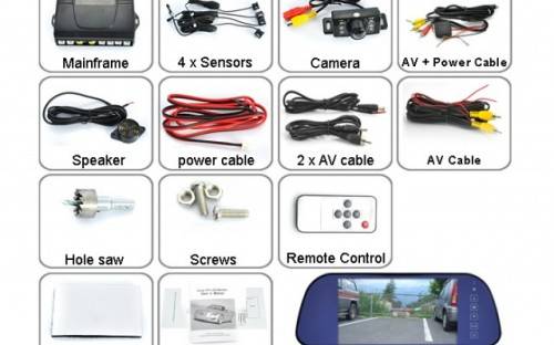 Complete Car Reversing Set - Rearview Camera, 4 Parking Sensors, Rearview Mirror