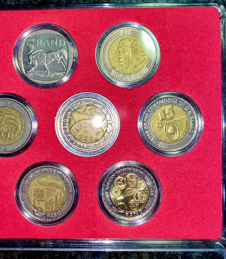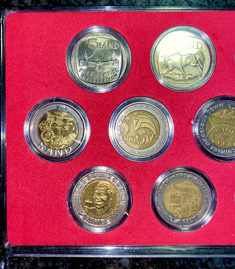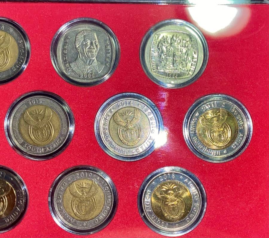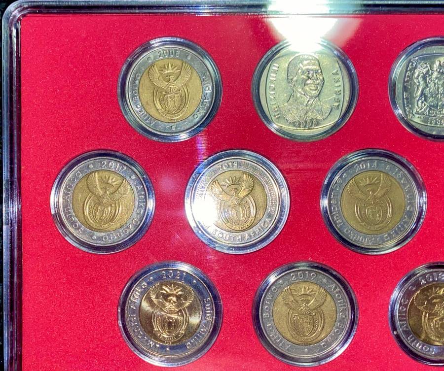 COMPLETE SET OF SOUTH AFRICAN 5 RAND COINS 1994 TO 2021 IN LOVELY DISPLAY CASE AND EACH COIN IS IN ITS OWN CAPSULE