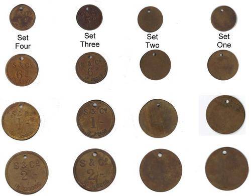 On auction is a complete set of Strachan and Co token coins - sixteen pieces being the four sets outlined below and all denominations - 2/-, 1/-, 6d and 3d