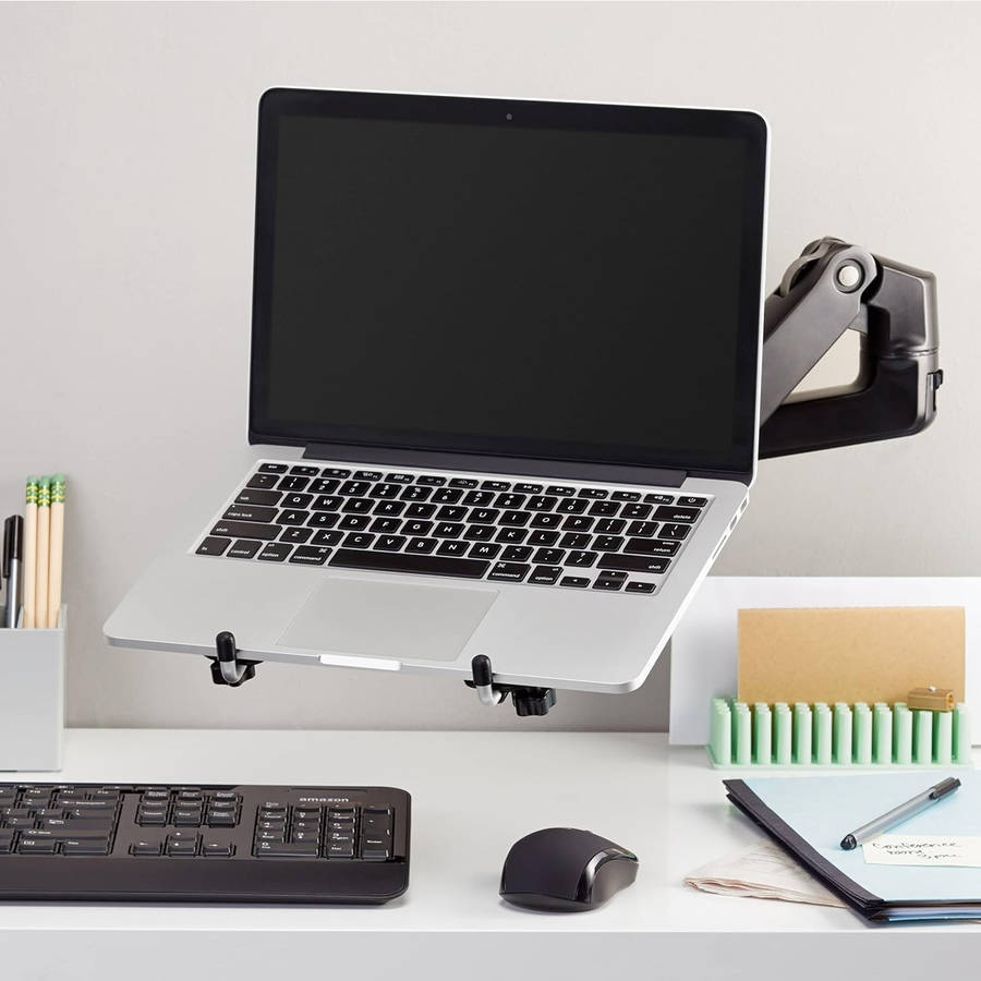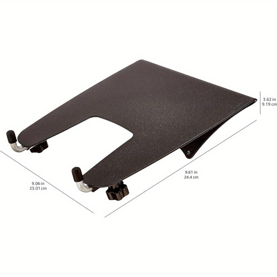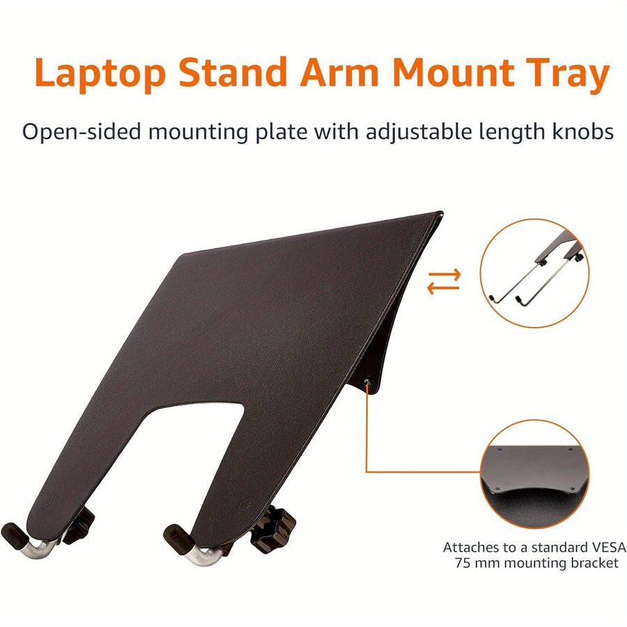 This laptop tray is designed to fit a wide range of VESA mounts featuring 100x100mm hole patterns, accommodating laptops ranging from 6 to 17.3 inches and weighing up to 28.6 lbs. Its ergonomic design promotes a comfortable working position, whether seated or standing, and helps alleviate issues related to posture, including muscle strain, wrist pain, and repetitive stress injuries. The L-shaped blocker and non-slip pads ensure that the device remains securely in place, preventing any accidental slips.