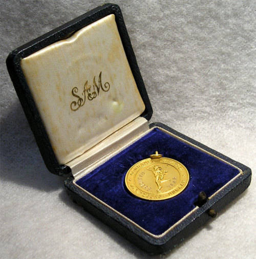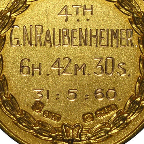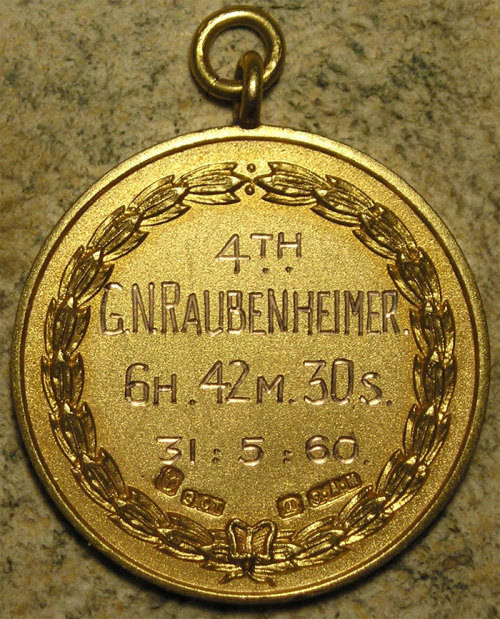 A Comrades Marathon Gold Medal. Awarded to Nick Raubenheimer who tied for 4th place in the 1960 up run with Trevor Allen in a time of 6h42m30s (see results image). In those days gold medals were only awarded to the first six competitors.
