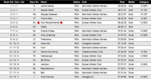 Raubenheimer competed in 22 runs (see images) between 1953 and 1975. He won 6 gold medals (1956, 1957, 1958, 1960, 1961 and 1964). His last win was as a veteran runner (over 40) and he came first in that class.