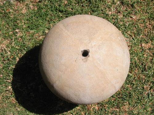 Concrete ball to serve as water feature. Small chips on top. Height 37 cm, diameter 24 cm.