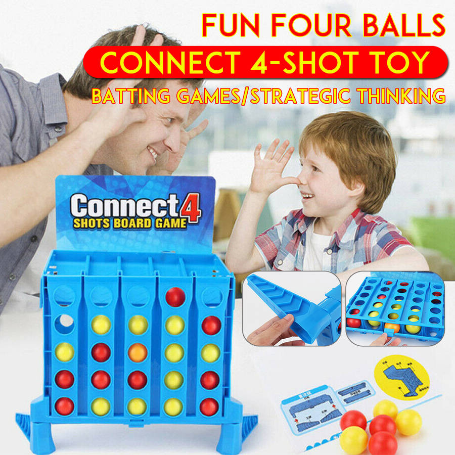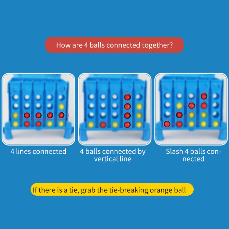 a The connect 4 shots game needs the winner got a same color ball line on the toy ball grid. Two players, each has one color ball. Players try to throw the ball on the desk and let it be reflected into the sliding slope. At last the ball roll into the grid. Each player takes turns throwing the ball.