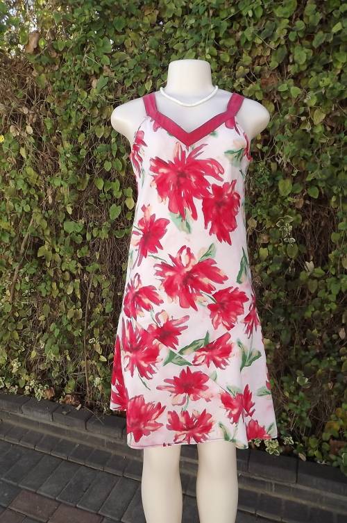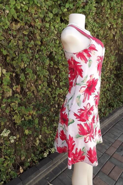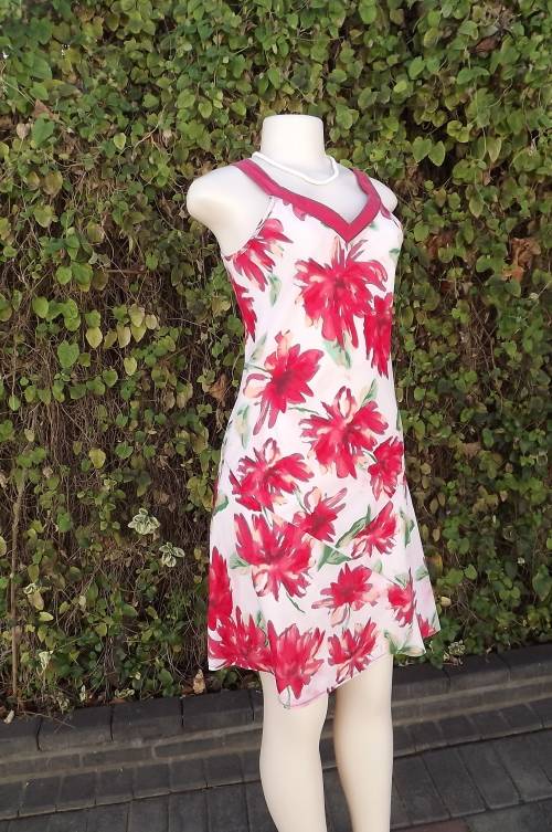 Cool cotton dress in white with bold crimson floral pattern.V neck with shoulder straps.Size 32/8
