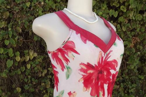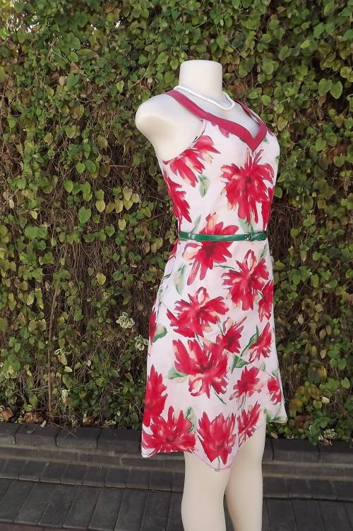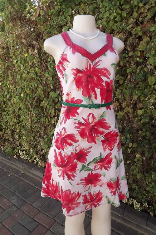 Cool cotton dress in white with bold crimson floral pattern.V neck with shoulder straps.Size 32/8.Can with belt or without belt.Shift style with panels at bottom.Used but fine for home wear.