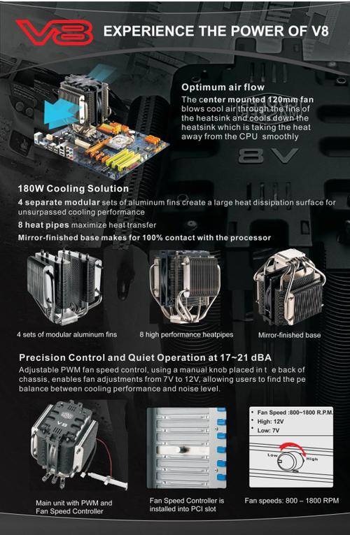 Challenging a new generations of PC mod-ding, the Cooler Master V8 revs up ahead with its tough guard cooling engine. Superior in its design, this wicked-fun V8 monster has enough horsepower to out-perform its duties with any high-performance CPU while under the most critical heat conditions. On top of its stylish finish, the V8 Cooler has quite some rich features. For heat dissipation it is supported with it's smart 180W cooling solution. Modularized by 4 separate set of aluminium fins and linked by 8 diagonal up-rise heat pipes, the V8 structural design allows speedy heat transfer to a large heat dissipation surface. The V8 is compatible with all current CPU sockets, and provides unsurpassed cooling performance