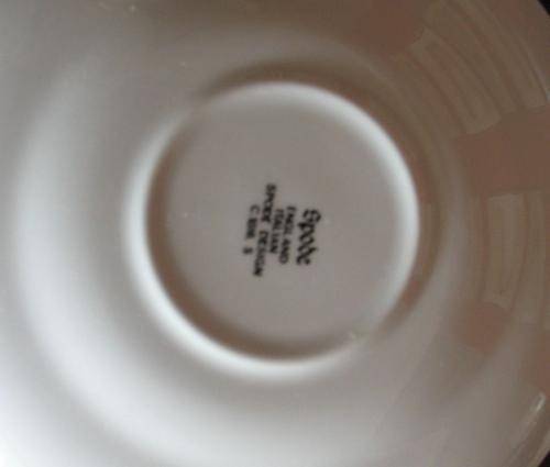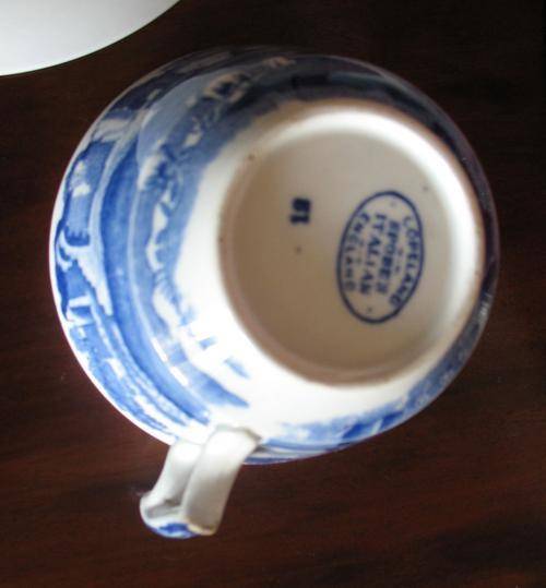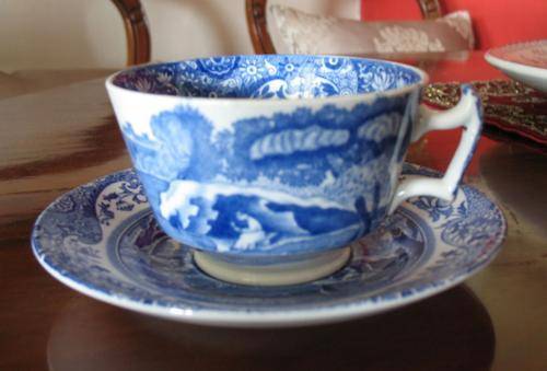 Gorgeouse Spode Italian pattern teacup and saucer. The cup has the older Copeland Spode Italian mark underneath, while the saucer has the black stamp (see below).