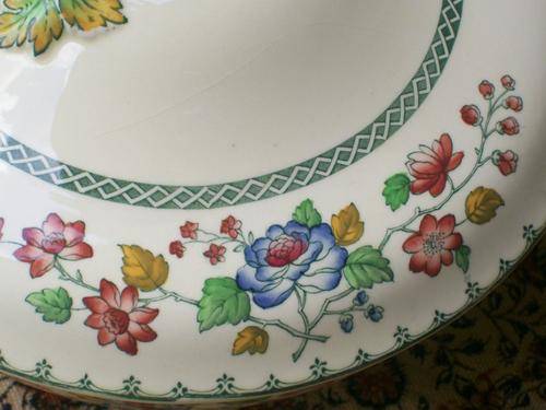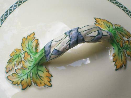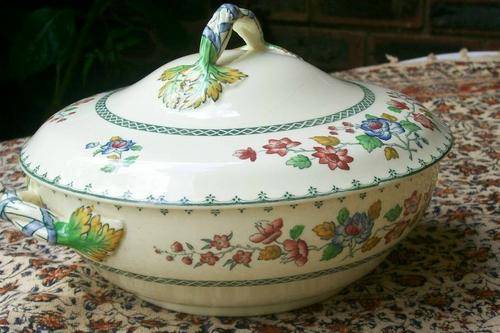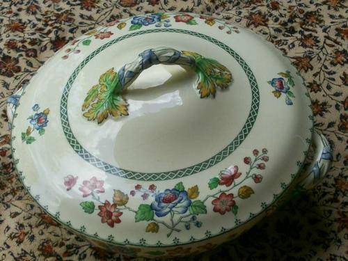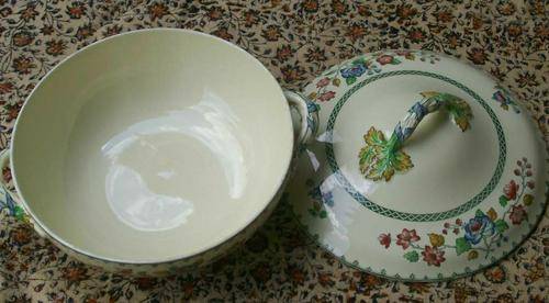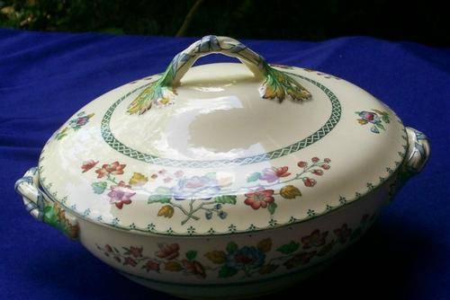 A LOVELY LIDDED TUREEN MEASURING APPROXIMATELY 14 CM HIGH TO THE TOP OF THE LID HANDLE AND 25 CM ACROSS, HANDLE TO HANDLE. DECORATED WITH COLOURFUL FLOWER SPRAYS ON A PALE YELLOW BACKGROUND. THE HANDLES ARE A RAISED DESIGN OF TWISTED VINES AND LEAVES. THERE IS A HAIRLINE CRACK TO THE LID, BUT VERY FAINT AS CAN BE SEEN IN THE SECOND PHOTO ON THE LEFT. PATTERN NO. S.2128.