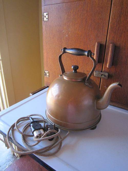 Lovely old big electric pot belly copper kettle with wooden handle that works perfectly. In very good condition and marked 'Premier System, Pattent Automatic Safety Device, Brit. Pat No 240910. Made in England' 'Pattern no 2649, serial no M41430. Inside is silver colour (not sure what metal) and I would say it would carry at least 2.5l of water, it is also quite heavy so postage would be about 80.00. Size 32cms high, 33cms long and 25cms wide.