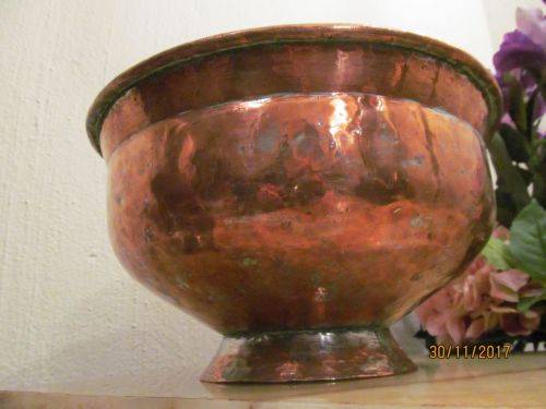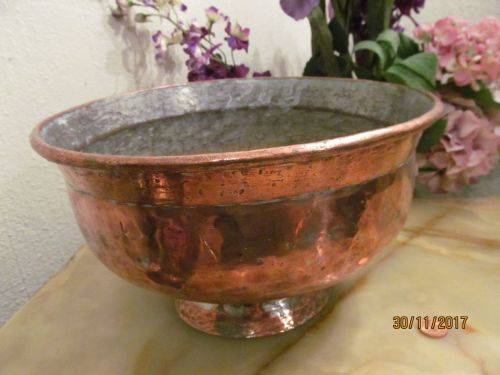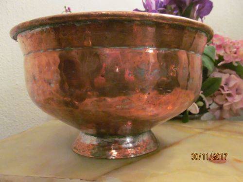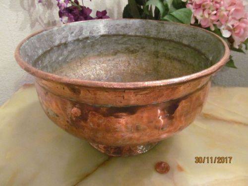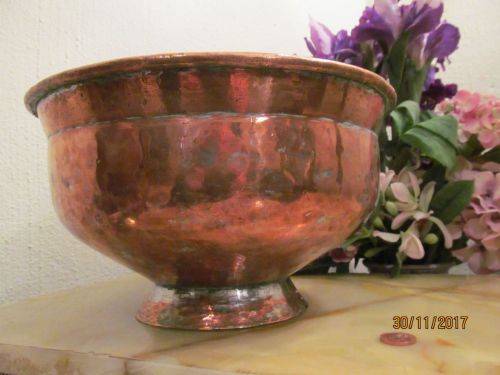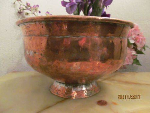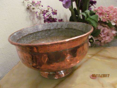 WHETHER AN URN, POT OR PLANTER, THE ITEM HAS A UNIQUE DECORATIVE APPEAL WHICH REACHES DEEP INSIDE THE HUMAN PSYCHE AND AWAKENS THE DESIRE FOR VISUAL SPLENDOR. A LARGE URN / PLANTER WHICH IS COMPLETELY HAND MADE AND STANDS FIRMLY UPON A FLARED CIRCULAR BASE. THE SURFACE OF THIS METAL ITEM HAS BEEN CLAD IN COPPER AND ADORNED WITH A HAMMERED METAL PATTERN WHILE THE GENTLY FLARED RIM IS A ROLLED METAL DESIGN