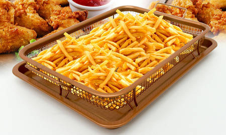 The Copper Crispy tray is an amazing new innovation that works like an airfryer in your oven and allows you to grill & cook food to that crispy, crunchy texture without adding oils or fat. The secret is the uniquely elevated nonstick tray that allows superheated air to pass through and circulate 360 degrees around your food for the perfect crisp and brown all around. With the Copper Crisper, you won’t have to worry about turning your food or burning. The easy grip handles make handling the Copper Crispy tray easy. The ceramic coated nonstick basket is designed for easy airflow so that your food gets evenly cooked. The ceramic coated nonstick cookie sheet keeps drippings and crumbs from making a mess at the bottom of your oven.