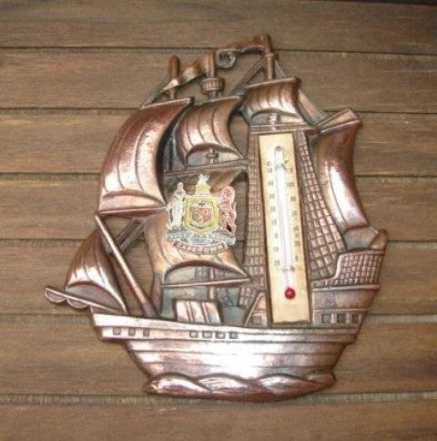 A COPPER SHIP SHAPE THEMOMETER, WITH BADGE MARKED, SPES BONA CAPE TOWN, height 14.5cm, weight 267gsm.
