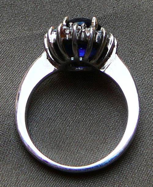 This is copy of Princess Diana's Engagement ring which is now worn by the Duchess of Cambridge. It was made for Marks & Spencer, it is made up of a central blue glass stone surrounded by white diamante/glass set in a silver coloured metal. It weighs 5 grams and the ID is 18 mm.