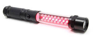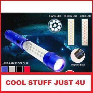 Strong aluminium alloy casing; Cylindrical high end design; 3-in-1 torch, work lamp & flashing red hazard light; Super bright; Magnetic attachment for hands free use; 9 x LED torch; 18 x LED work lamp; 8 x red flashing LED. Requires 3 x AAA batteries (not included); Length: 230mm(9"); Diameter: 30mm (1.2")