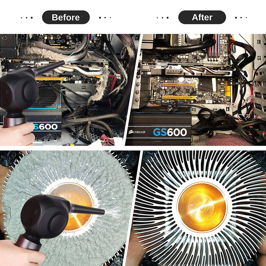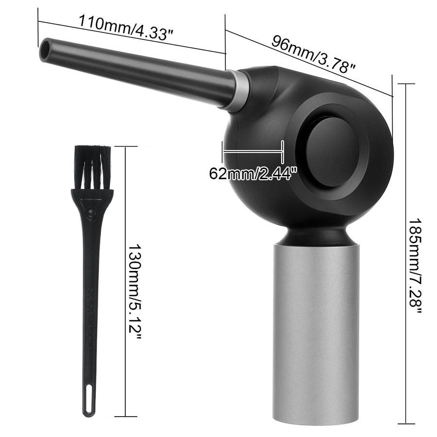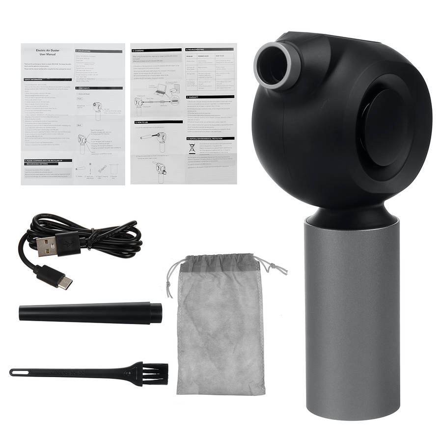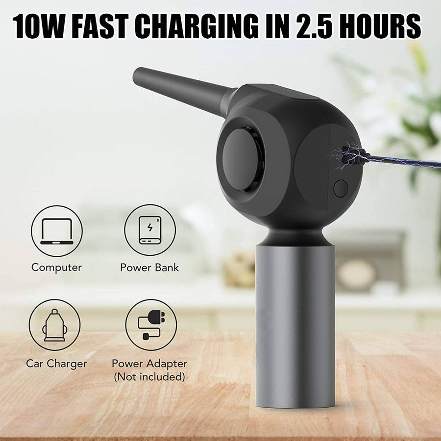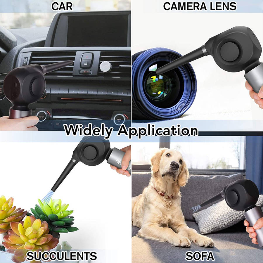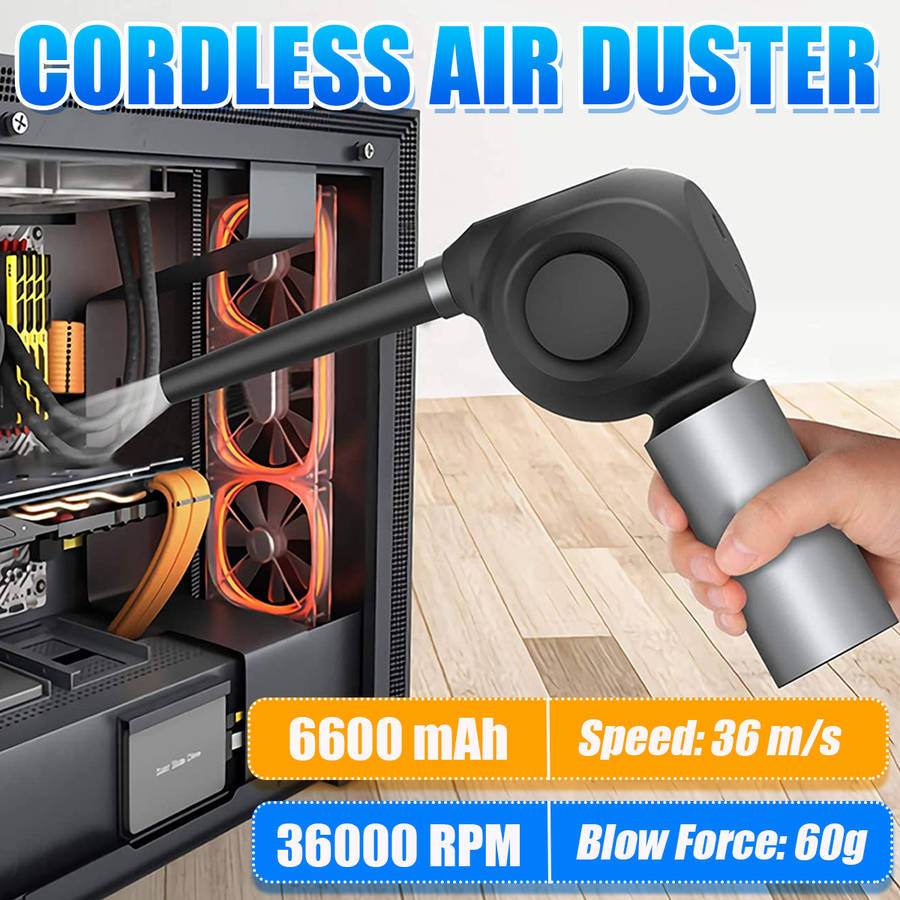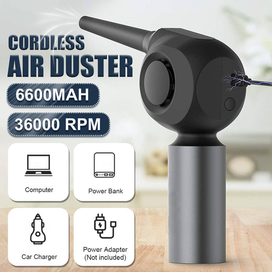 Features: POWERFUL CORDLESS AIR DUSTER Our wireless air duster has a 36,000 RPM motor, which can generate a powerful air thrust of nearly 10 levels of strong gale (36m/s) to deeply clean microscopic dust. It can be used to deep clean computers, printed circuit boards, electronic instruments, medical equipment and more electronic parts, but traditional wipers or dusters cannot achieve such deep cleaning. RECHARGEABLE ELECTRIC AIR DUSTER Built-in large rechargeable 6600mAh lithium battery allow this electric air duster to run continuously for nearly 35 minutes. The compatibility of charging through the Type-C port makes it easy to charge.This portable air blower is highly reusable with its rechargeable function. Suitable for cleaning dust for your keyboard, camera, car, sofa, air conditioner, razor, window sill, decorative ornaments, succulents, and any hard-to-reach areas. 10W FAST CHARGING This air duster is specially designed to get charged faster with a 2A adapter (not included). With a reduced charging time of around 2.5 hours, its usability can be highly increased. It can be charged by multi-charging devices, such as: computer, mobile power, car charger, adapter. HANDHELD DESIGN & EASY TO USE The air dust blower adopts an ergonomically designed handle, and the nozzle is detachable, comfortable to hold and save space. It is very easy to use, gently press the button to let it work. It can blow away all stubborn, hidden and hard-to-reach dust. it also can be used as an air blower for outdoor barbecue,camping. ALTERNATIVE TO COMPRESSED AIR CANS We all have the responsibility to save gas and water. To achieve this goal, we made this highly environment-friendly device as it allows more than 5000 times of use, resulting in saving a lot of energy. This mini air duster is such a scientific device which keeps cleanliness hand in hand with eco-friendly.
