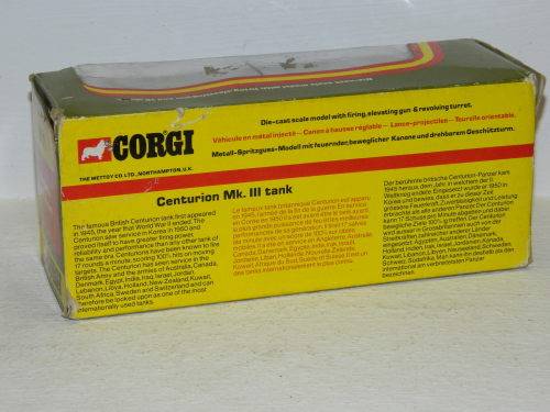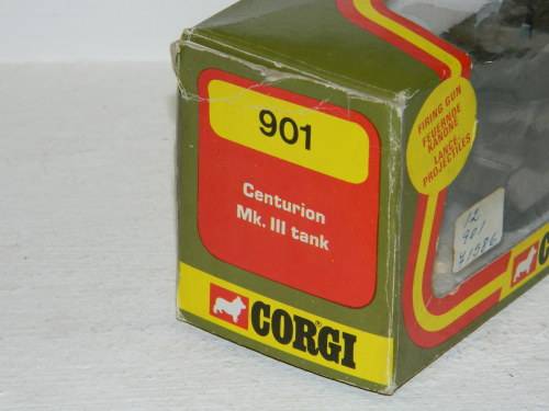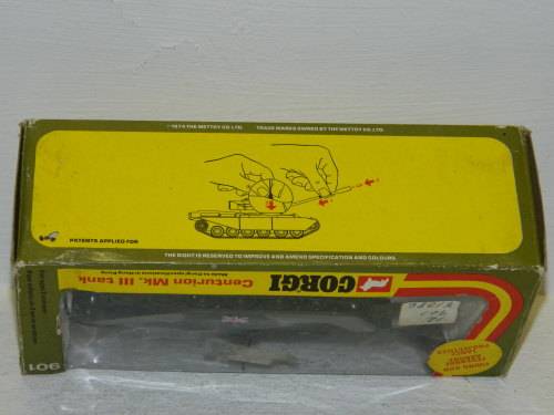CORGI TOYS - 901 - CENTURION MK. III TANK.............MADE IN HONG KONG FOR CORGI METTOY CO. LTD. DURING 1974 - 1978 ............................. THIS TOY TANK FIRES PLASTIC PROJECTILES AS SHOWN ON BOTTOM OF BOX................ THIS TOY TANK IS STILL IN MOST EXCELLENT CONDITION AND COMES COMPLETE IN ITS ORIGINAL BOX...................... PLEASE SEE PHOTOS.
