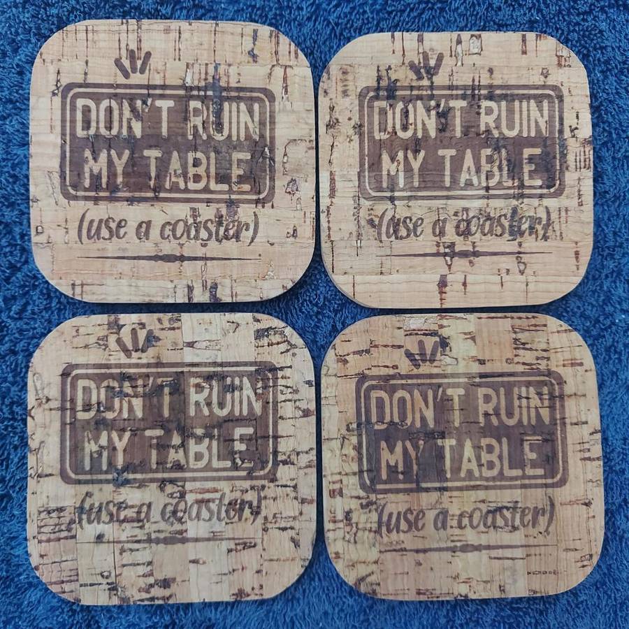 4 x Beautiful laser engraved Cork coasters on hardboard backing in a case, to protect your furniture