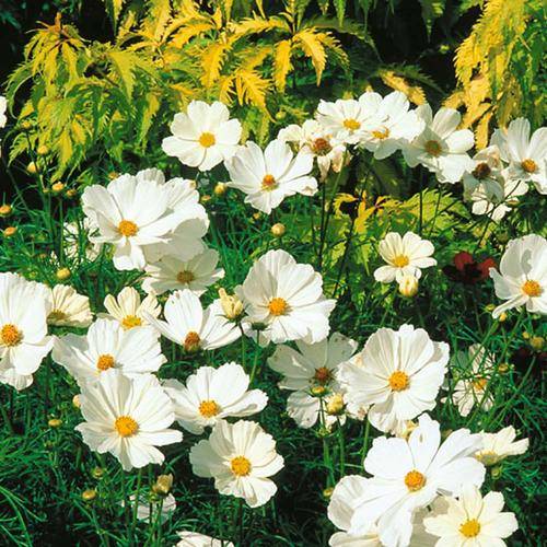 This beautiful dwarf Cosmos reaches a maximum height of 60cm making it perfectly proportioned for sunny borders and containers. The 8cm wide, daisy-like blooms of Cosmos 'Sonata White' float above the finest lacy foliage. Strong stems and a long vase life make this compact annual ideal for cutting for an elegant bouquet. Cosmos 'Sonata Series White' is particularly useful for exposed positions. Height: Up to 60cm.