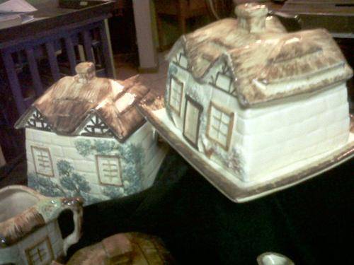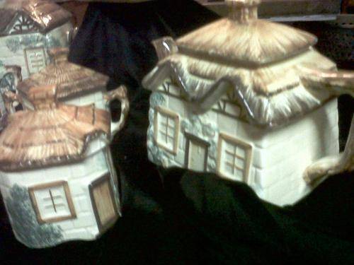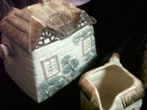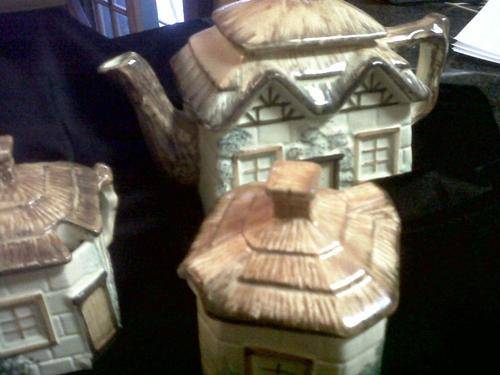 Teapot (with lid), creamer, sugar bowl 1 (two-handled with lid), sugar bowl 2 (with lid), butter dish (with base), biscuit jar (with handle and lid). Excellent condition - see photos! Backstamped with the Keele Pottery marks. Normally, each piece sells for up to R450 or more!!!