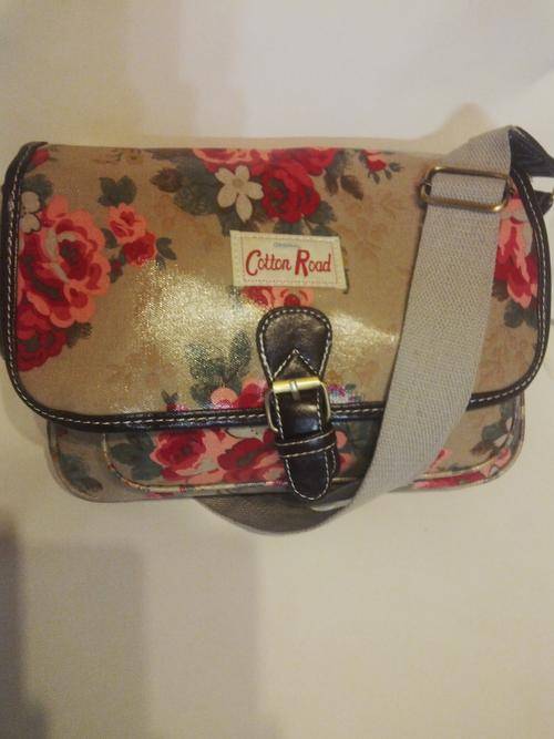 CAMEL OILCLOTH MESSENGER SLING BAG WITH CORAL ROSE!