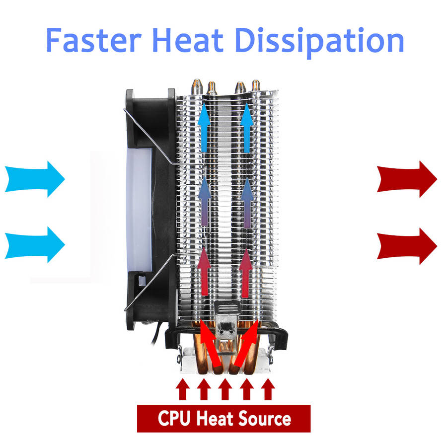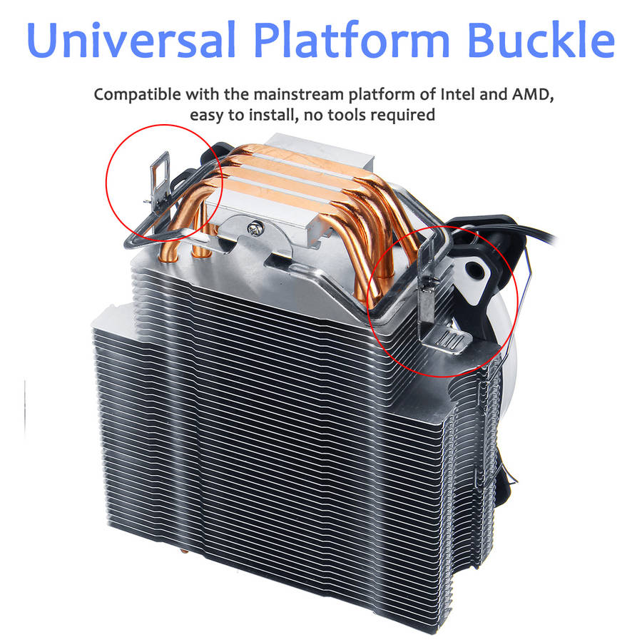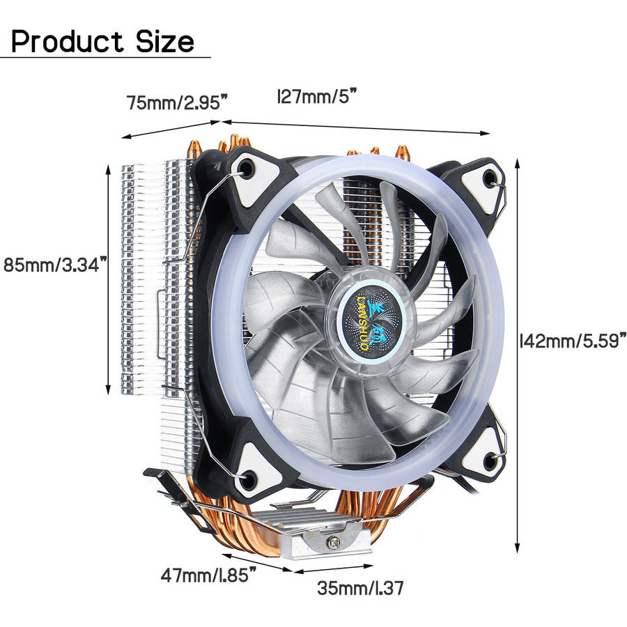 Specification: Product Name: CPU Cooler Compatible CPU: for Intel/AMD Heatsink Material: Copper & Aluminum Size: Product: 75*127*142mm/2.95*5*5.59 Fan: 120*120*25mm/ 4.72*4.72*0.98 Application: Processor Bearing Type: Hydraumatic Power Interface: 3 Pin Noise: 22dBA Type: Heatpipe Fan Life: 50000 hrs Fan Speed: 2200RPM Heat Pipes Quantity: 4 Fan Quantity: 1 Support CPU Platform: for Intel LGA 775/1150/1151/1155/1156/1366 and AMD all platforms Features: 1. Super mute fan with built-in solid state silent capacitor. 2. Cool aurora five color lights when running. 3. Pure copper heatsink accelerates heat dissipation. Note: -The color of the item may vary slightly due to photography and different PC monitor. -The size might be slightly different due to manual measurement. Your kindly understanding would be appreciated.
