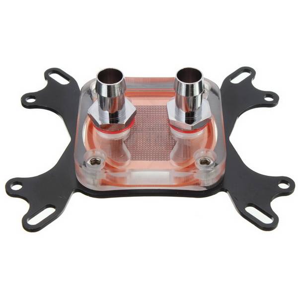 It has two chrome plate copper faucets. The external diameter is 10 mm. The height of the copper base is 5 mm. It has inner water channel. The water contact area is large, thus to carry more heat from the CPU quickly.