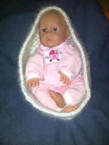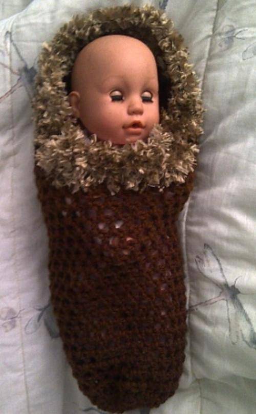 Stork Pouches : Black and white ones in plain yarn, the fuzzy one was a custom order. The doll gives an idea of how much the pouch stretches with baby in it.