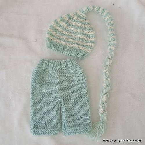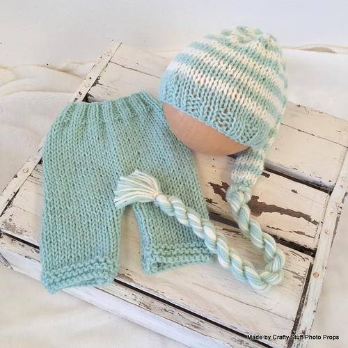 Little Striped Pixie Hat and matching trousers, in cream and sage green