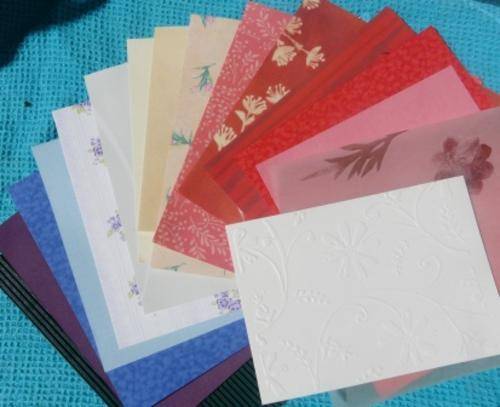 *approx 16 pieces of paper or card, embossed paper and vellum in a variety of colours and textures