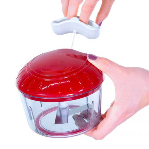 Traditional food processors are bulky, noisy, and take up too much room. Crank Chop is the quiet and compact way to chop, dice, mince, and puree veggies. Simply place veggies or meat into Crank Chop, attach the lid, and pull the cord - you've got perfectly chopped food in seconds. The more you pull the durable parachute nylon cord, the finer the chop. Each pull unleashes the power of 24 knives. Crank Chop does not use electricity to operate, making it the ideal food chopper to take along on camping and RV trips.