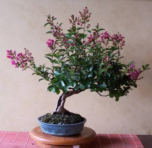 With delicate, crinkled vibrant pink/purple flowers blossoming mid to late summer, the Dwarf Crepe Myrtle bonsai tree adds beautiful abundance of color to any deck, patio or garden. The flowers have six or seven crinkly-edged petals on stalks which occur in spike-like clusters. The tree's sinewy, fluted stems support opposing leaves of fresh green. These lovely plants never disappoint, providing long-lasting blooms, great fall foliage color, silvery exfoliating bark and an attractive branching form in winter.