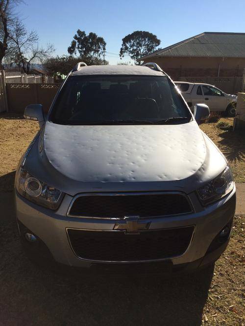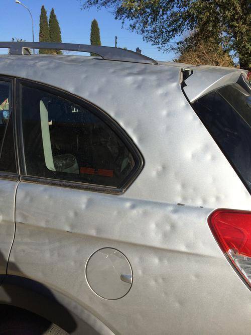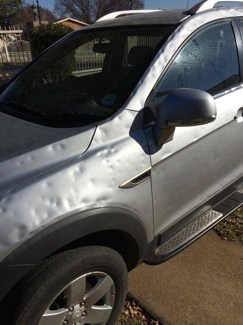HAS HAIL DAMAGE ON ROOF AND ENTIRE LEFT SIDE