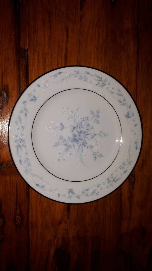 A Noritake tea plate decorated in the Carolyn pattern, which features a powder blue floral design accented by tiny white and blue flowers with silver trim set on a pure white background. This is an ideal replacement item.