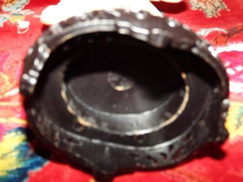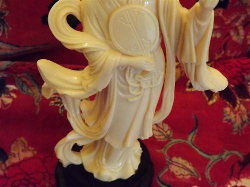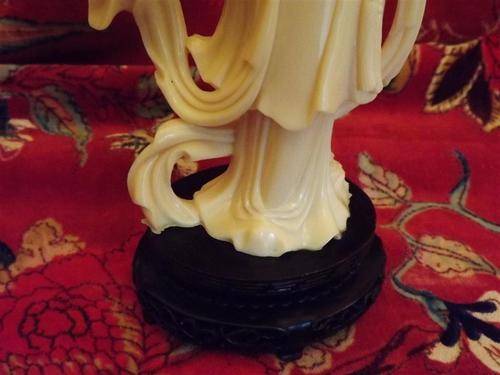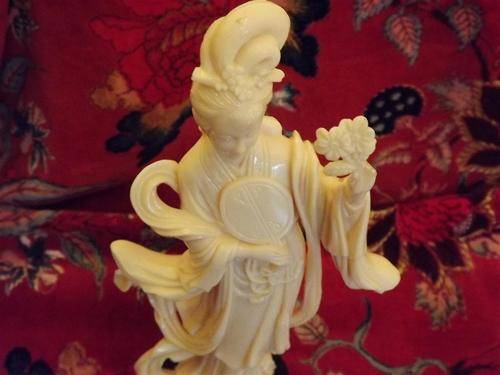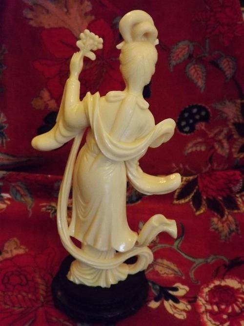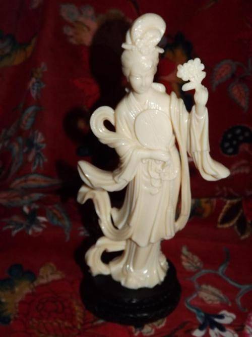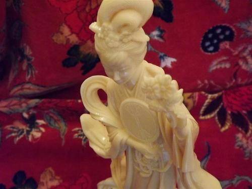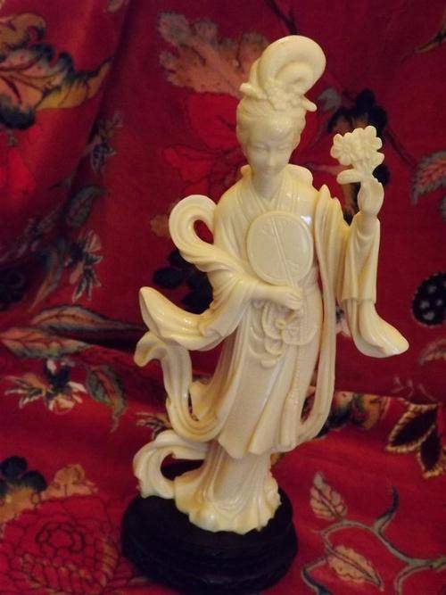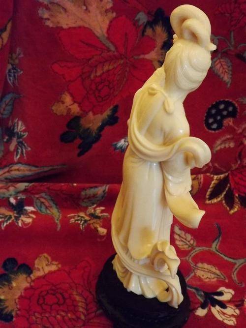 On offer I have this antique absolutely stunning cream coloured resin / hard plastic type oriental geisha woman ornament holding flowers and a fan standing on a elevated ornate stand, with lovely detail - very typical of many of these beautiful oriental type pieces. It is Made in Hong Kong by a company Vita, as shown in the photographs above. This was part of my Grandparents oriental collection, this beautiful piece is over 40 years old.