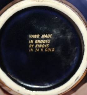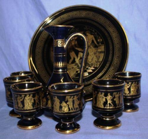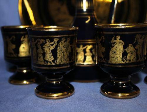 - 8 Pc Teaset Hand made In RHODES Greece in 24k Gold by Kinoys Teaset ( 3 cups have Chips) 1.325kg Plate 247mm , Jug 170mm tall , 6 x cups 72cm CONDITION: SOLD as FOUND - - Please see ALL IMAGES below |