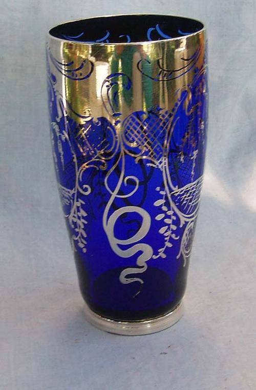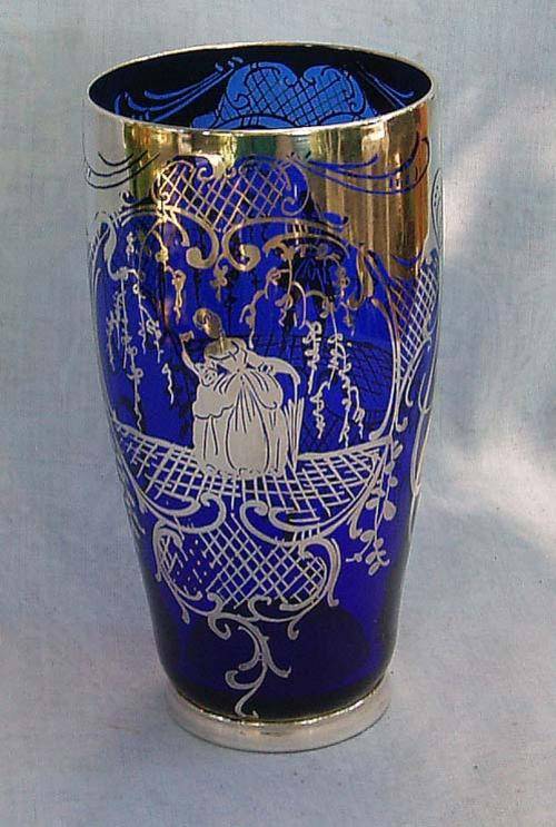 A VERY NICE VINTAGE BRISTOL BLUE GLASS VASE OR LARGE BEAKER, DECORATED WITH A GENEROUS STERLING SILVER OVERLAY, DEPICTING AN ART DECO STYLE CRINOLIN LADY AND GENT IN A GARDEN, COMPLETE WITH TRELLIS AND FRILLS. EXCELLENT CONDITION, SOME SLIGHT SILVER MISSES....NOT DUE TO WEAR...FACTORY OVERSIGHT, BUT NO ACTUAL WEAR TO SILVER, NO CHIPS SCRATCHES OR CRACKS....A TRULY STUNNING COLLECTABLE ITEM. WATCH OUT FOR AN EVEN MORE STUNNING PINK GLASS ART DECO 5 PIECE SILVER OVERLAY DRESSING TABLE SET.....SOON TO BE LISTED. ABSOLUTELY REMARKABLE!