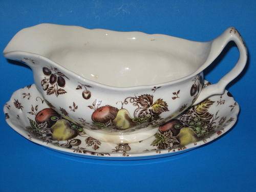 a Beautiful Johnson Brothers Sauce Boat and Tray in the "Autumn's Delight" Pattern. About 20cm in length and 8cm in height. Note a nick under the boat base rim and tray base.