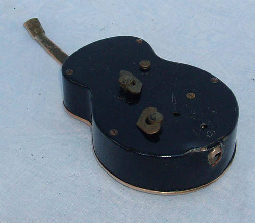 ON OFFER STARTING AT R1 ARE THESE TWO VINTAGE AND UNUSUAL TABLE CLOCKS. PARTICULARLY UNUSUAL IS THE SWISS MADE SWIZA CLOCK 17CM LONG IN THE SHAPE OF A GUITAR AND BONUS.....IT WORKS! THERE ARE TWO KNOBS MISSING ONE FOR ADJUSTING THE HANDS AND ONE FOR THE ALARM, BUT THE OTHER WINDERS ARE WORKING. THE GUITAR CLOCK HAD A STAND ORIGINALLY, BUT THIS HAS FALLEN OFF. THE CURVY CLOCK APPEARS COMPLETE AND INTACT, BUT IS A NON WORKER (CAN BE REPAIRED?). CURVY CLOCK IS 16CM HIGH, AND ALSO A SWISS SWIZA WITH 17 JEWELS. TWO INTERESTING CLOCKS FOR R1 NO RESERVE. POST R29. SEE MORE AMAZING CRAZY SALES.