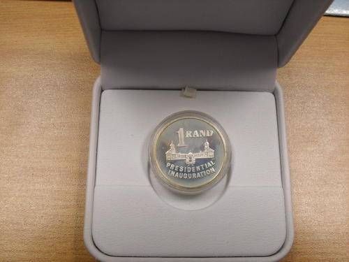 1994 SILVER R1 PROOF INAUGURATION COIN IN A WHITE DISPLAY CASE - THIS ISSUE IN THE WHITE BOX WAS MORE RARE THAN THE BLUE BOX.