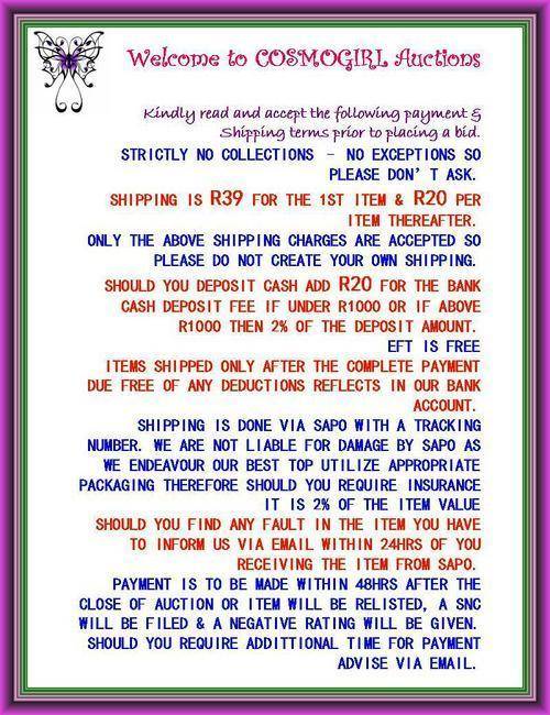 R65.00 Standard shipping applies to orders under R100.00, in most areas in South Africa. R35.00 Standard shipping applies to orders over R100.00. Some areas may attract a surcharge surcharge. This will be calculated at checkout if applicable. Check my rate