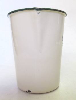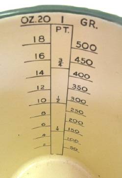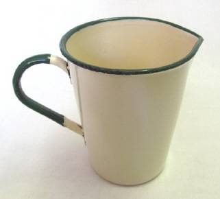 A cream and green enamel measuring jug (one pint, 20 ounces, 500 g). Condition good, except for a few unobtrusive chips.