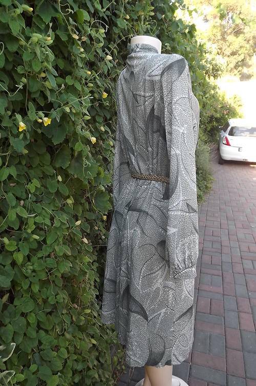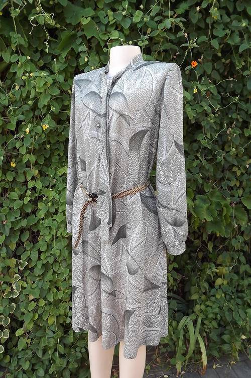 Cream and olive green vintage dress for those cooler days.Size 42/18.Banded tie collar long cuffed sleeves.Panelled A line.Poly cotton stretch fabric.Can wear with or without belt.
