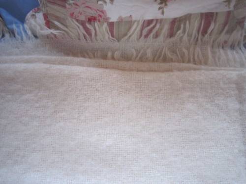 Lovely cream mohair throw to grace the bottom of your bed , it is made by Stuart Holdings which is the fabrics division of Cape Mohair LTD. The mohair content in this blanket is 78%, 13% wool and 9% nylon. Unfortunately it had a boo boo and has a light burn mark at the one corner and a small hole, as per the picture, other than that it is lovely. Length is 251cms and width is 254cms or visa versa. Postage on this item will be 95.00.