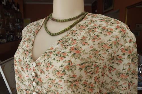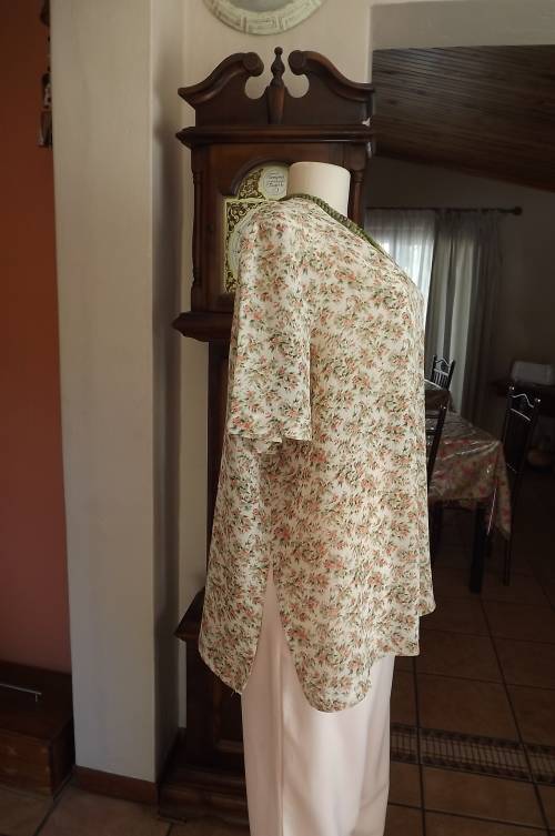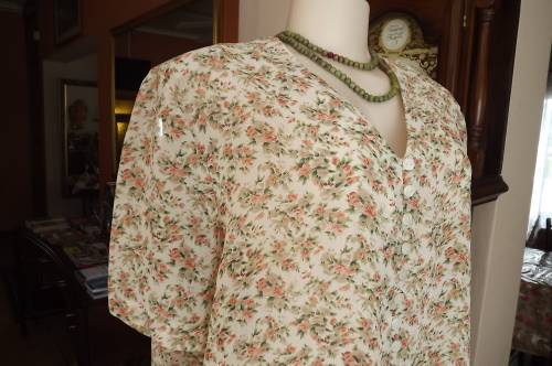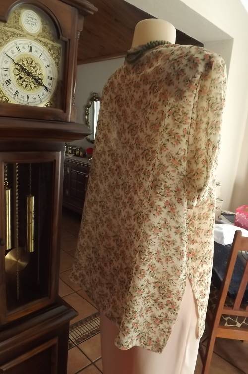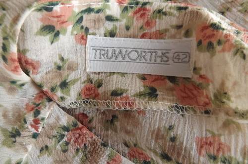 Cream v neck top with small peach flowers and green leafs.Short sleeves.Size 42/18 by TRUWORTHS with buttons and loops.Slitted sides.In 100% wash + wear polyester.As new