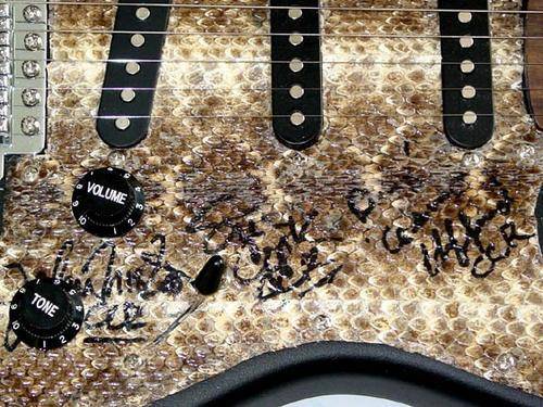 This is a brand new guitar hand signed in person by CCR! This guitar is a custom made one of a kind prototype guitar that John Tristao was interested in having Kass make for him. It is hand signed by Doug "Cosmo" Clifford, Stu Cook, and JohnTristao. It is black with rattlesnake skin on the pickguard and head. This guitar is one of a kind! More than just a show piece, this guitar is a brand new full size guitar which is fully functional. This is PSA/DNA authenticated (see below). |
