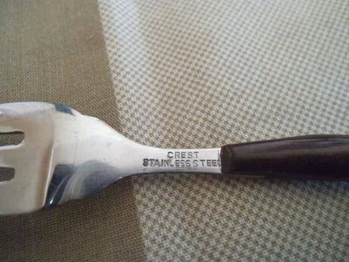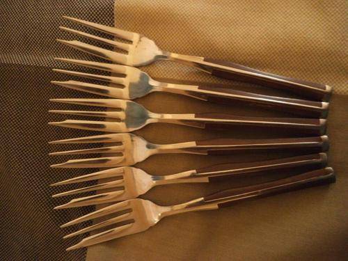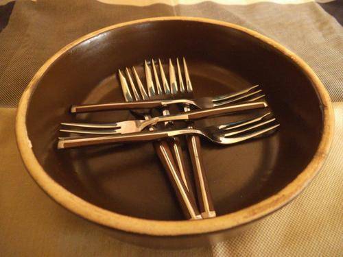 On auction we have 6 x Crest Stainless Steel cake forks and a matching brown pottery bowl.