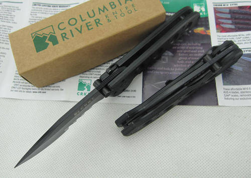 As is standard practice on CRKT folders, lubrous washers at the blade pivot assure velvety-smooth one-hand opening and closing, using Kit Carson's trademark dual checkered thumb studs which also act as a blade stop.